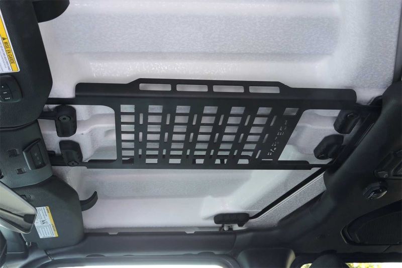 Storage space inside of a Jeep Wrangler or Gladiator can be challenging at best. One of Fabtech’s solutions is an Overhead Molle Rack that utilizes the free space near the headliner between the two front seats. The Overhead Molle Rack is a one piece design that bolts to the windshield frame and the rear sport bar. It’s built so that you can remove the factory hardtop without tools and will stay in place with the top removed. The Rack features a Molle and ball stud pattern for easy fastening of compatible storage accessories such as Molle bags, boxes? and straps. The ball stud pattern allows the installation of ball stud mounts for electronics such as cell phones, communication radios, GPS devices and more. This high quality Overhead Molle Rack is finished in a texture black powder coat and is the perfect solution for Jeep owners looking for more interior storage space.