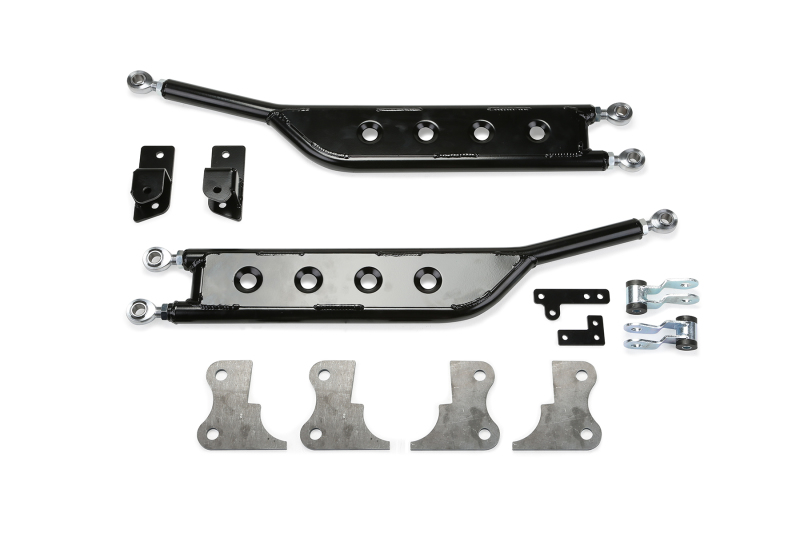 Reduce rear leaf spring axle wrap caused by tall lift blocks, high torque engines and oversized tires with Fabtech’s heavy duty Traction Bars. These Traction Bars utilize a shackle design on one end to allow movement with the arc of the leaf spring travel. This provides a non binding, smooth highway ride yet still provides positive resistance to torque loads. Tubular construction with adjustable heims. Dimple die side plate for strength. Floating shackle at frame provide smooth highway ride. Controls rear leaf spring wrap from high torque engines.